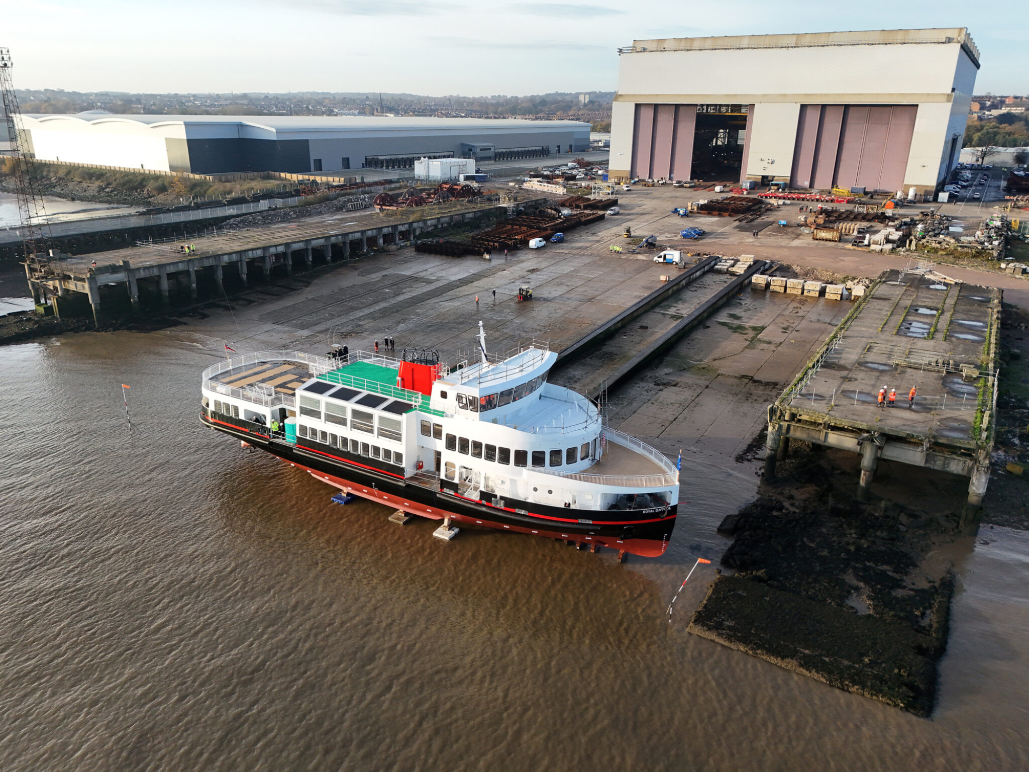 In a carefully managed 24-hour operation, the Royal Daffodil was moved out of APCL Cammell Laird’s construction hall to the river’s edge to allow the incoming tide to slowly lift her clear and float the vessel for the very first time.